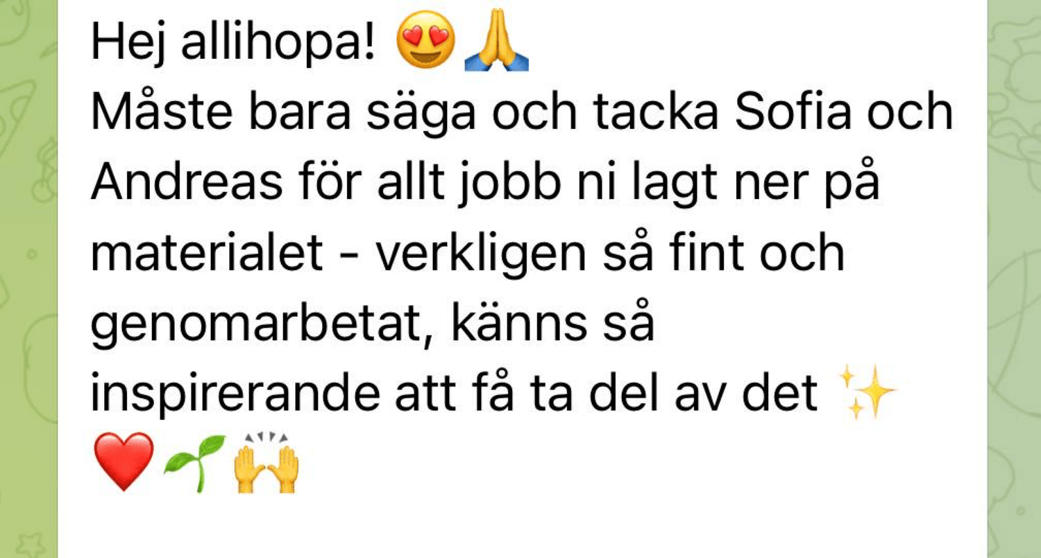 Vi är med dig hela vägen! Under våra live-samtal får du personlig vägledning, kan ställa frågor och få direkt feedback. Inspelningar finns för dig som vill gå i egen takt.