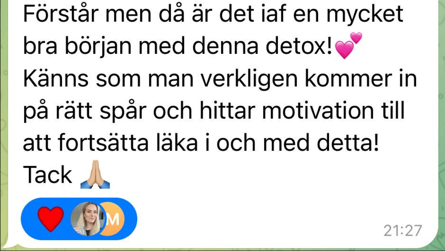 Få daglig pepp, inspiration och direktkontakt med oss och andra deltagare. Ställ frågor, dela erfarenheter och få stöd under hela detoxresan – du är aldrig ensam!